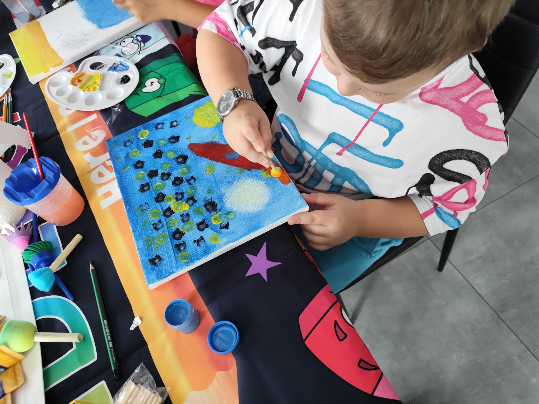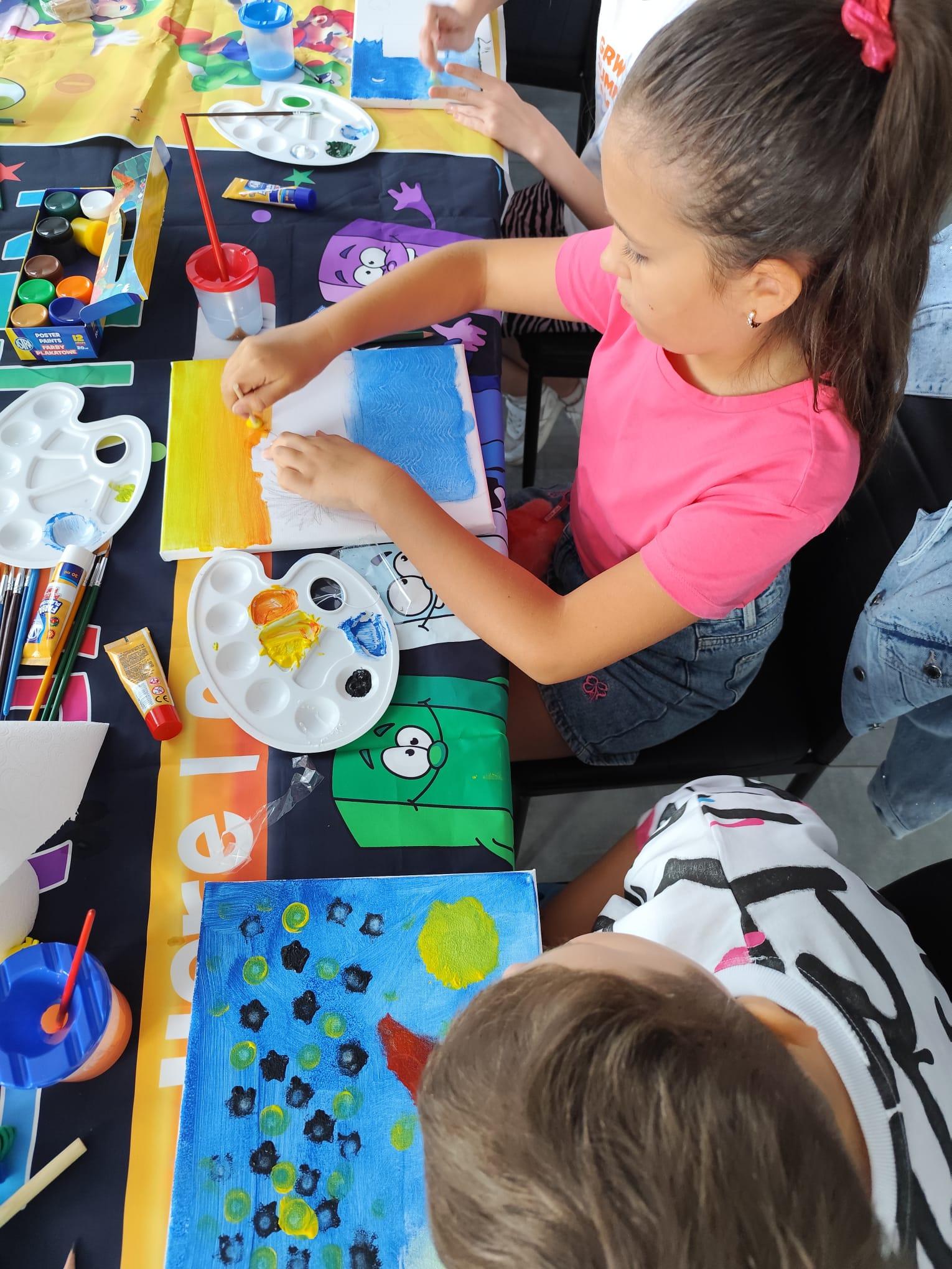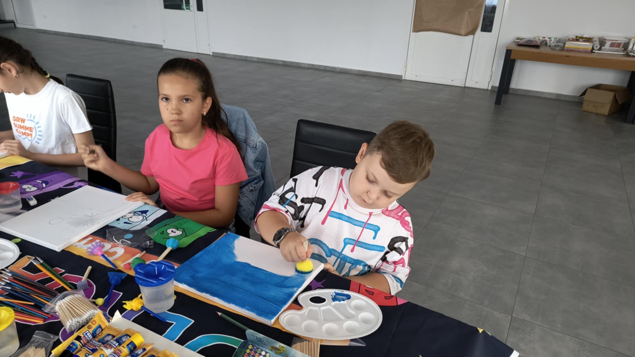 Spotkanie rozpoczęło się od wspólnego stworzenia regulaminu i zasad zachowania, które będą obowiązywać podczas całych wakacyjnych spotkań. Pierwsze warsztaty obfitowały w różnorodne aktywności. Dzieci mogły spróbować swoich sił w malowaniu na płótnie, wykorzystując różne techniki i metody artystyczne. Nie zabrakło również zajęć manualnych, uczestnicy wykonali breloczki ozdabiane cyrkoniami, które każdy mógł zabrać na pamiątkę. Z kolei wyjście na plac zabaw pozwoliło dzieciom rozruszać się i spędzić trochę czasu na świeżym powietrzu.