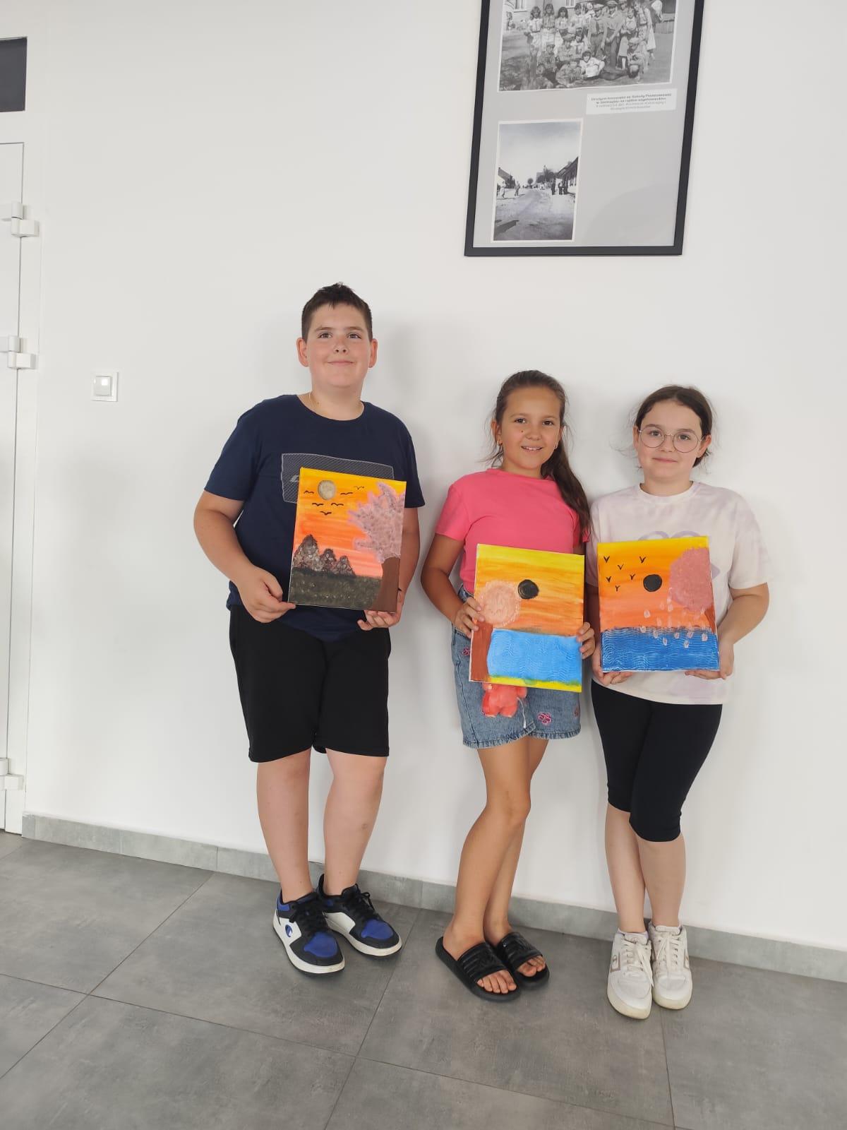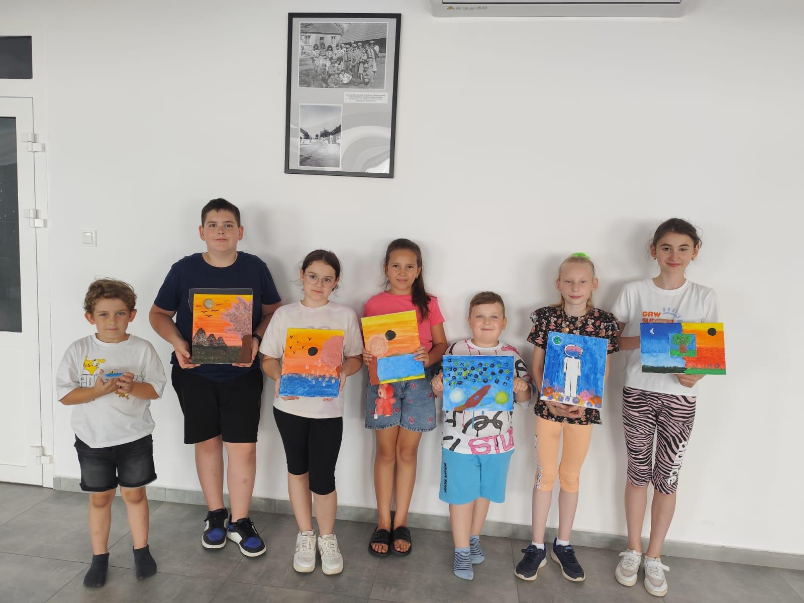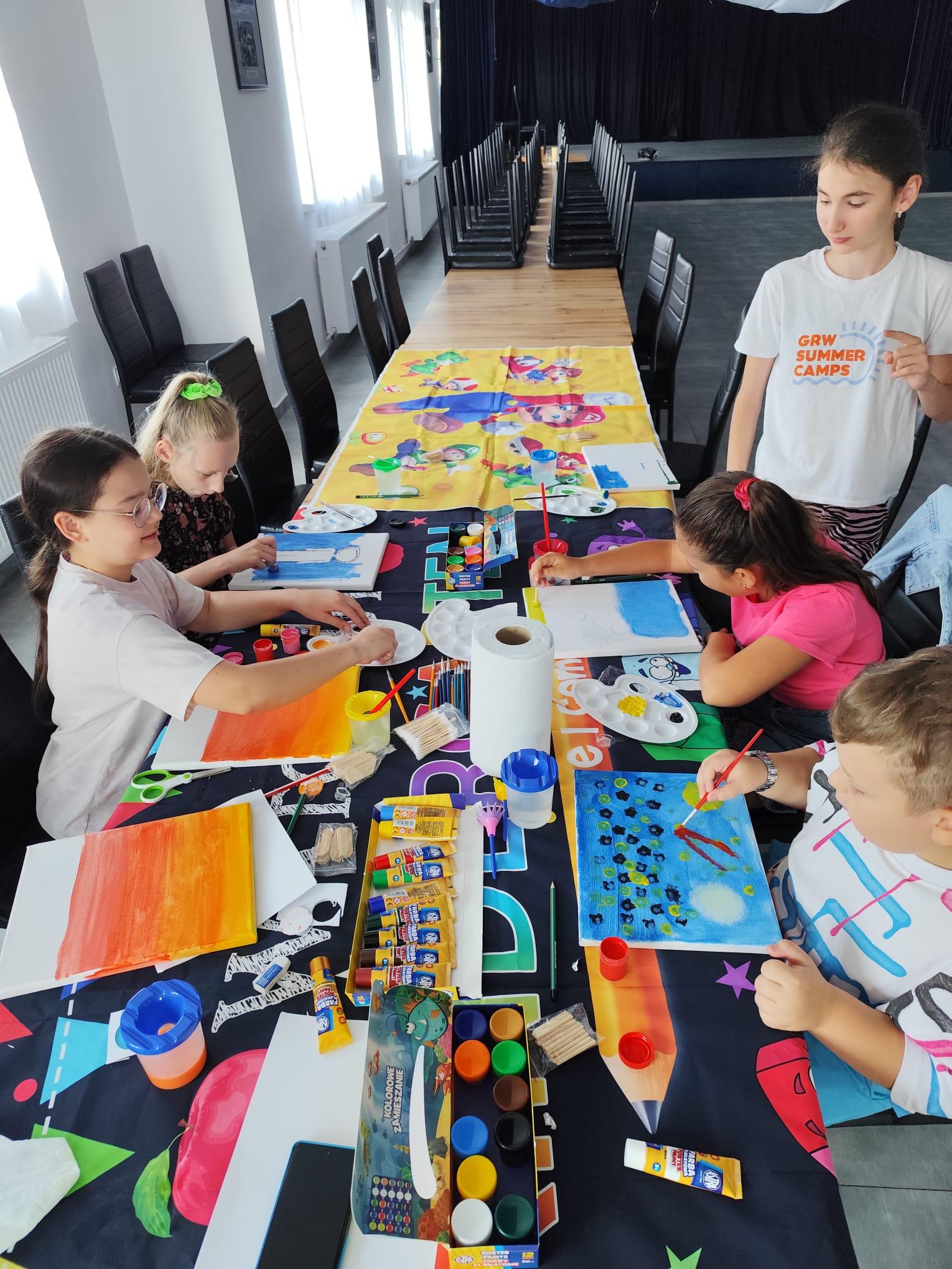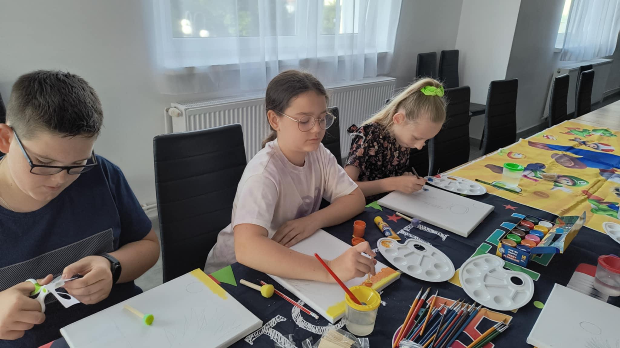 Spotkanie rozpoczęło się od wspólnego stworzenia regulaminu i zasad zachowania, które będą obowiązywać podczas całych wakacyjnych spotkań. Pierwsze warsztaty obfitowały w różnorodne aktywności. Dzieci mogły spróbować swoich sił w malowaniu na płótnie, wykorzystując różne techniki i metody artystyczne. Nie zabrakło również zajęć manualnych, uczestnicy wykonali breloczki ozdabiane cyrkoniami, które każdy mógł zabrać na pamiątkę. Z kolei wyjście na plac zabaw pozwoliło dzieciom rozruszać się i spędzić trochę czasu na świeżym powietrzu.