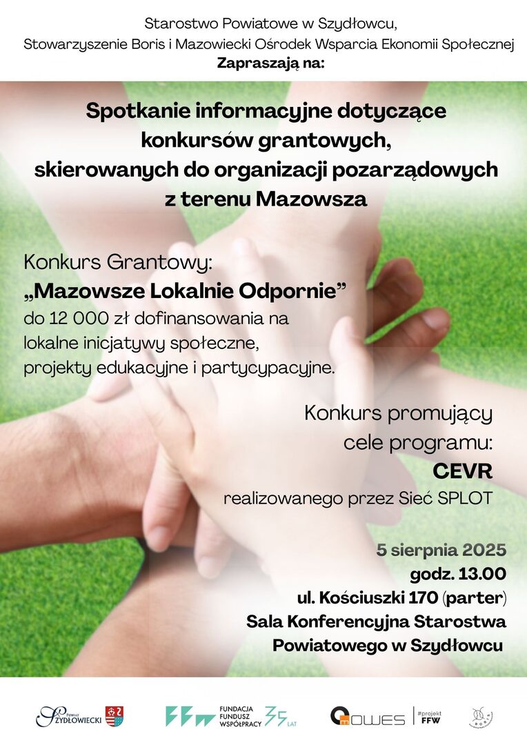 Starostwo Powiatowe w Szydłowcu wraz ze Stowarzyszeniem Boris oraz Mazowieckim Ośrodkiem Wsparcia Ekonomii Społecznej serdecznie zapraszają na spotkanie informacyjne poświęcone konkursom grantowym dla organizacji pozarządowych z Mazowsza.