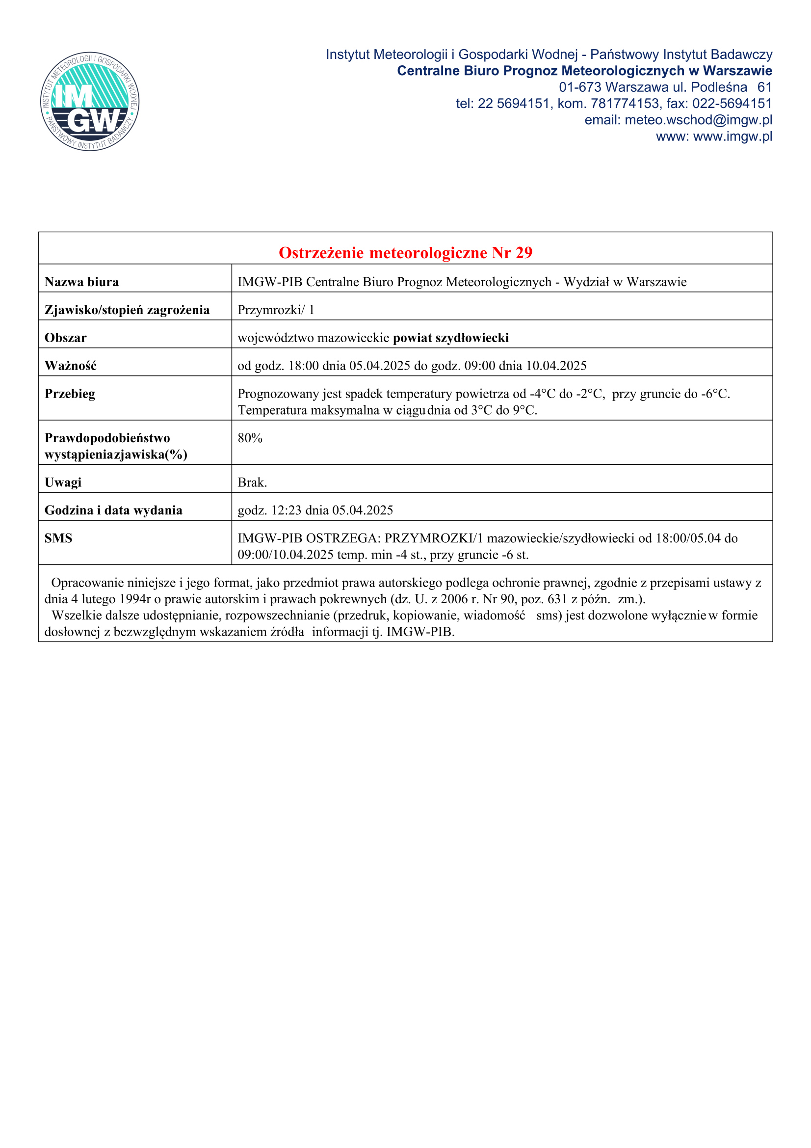 | Zjawisko/stopień zagrożenia | Przymrozki/ 1 |