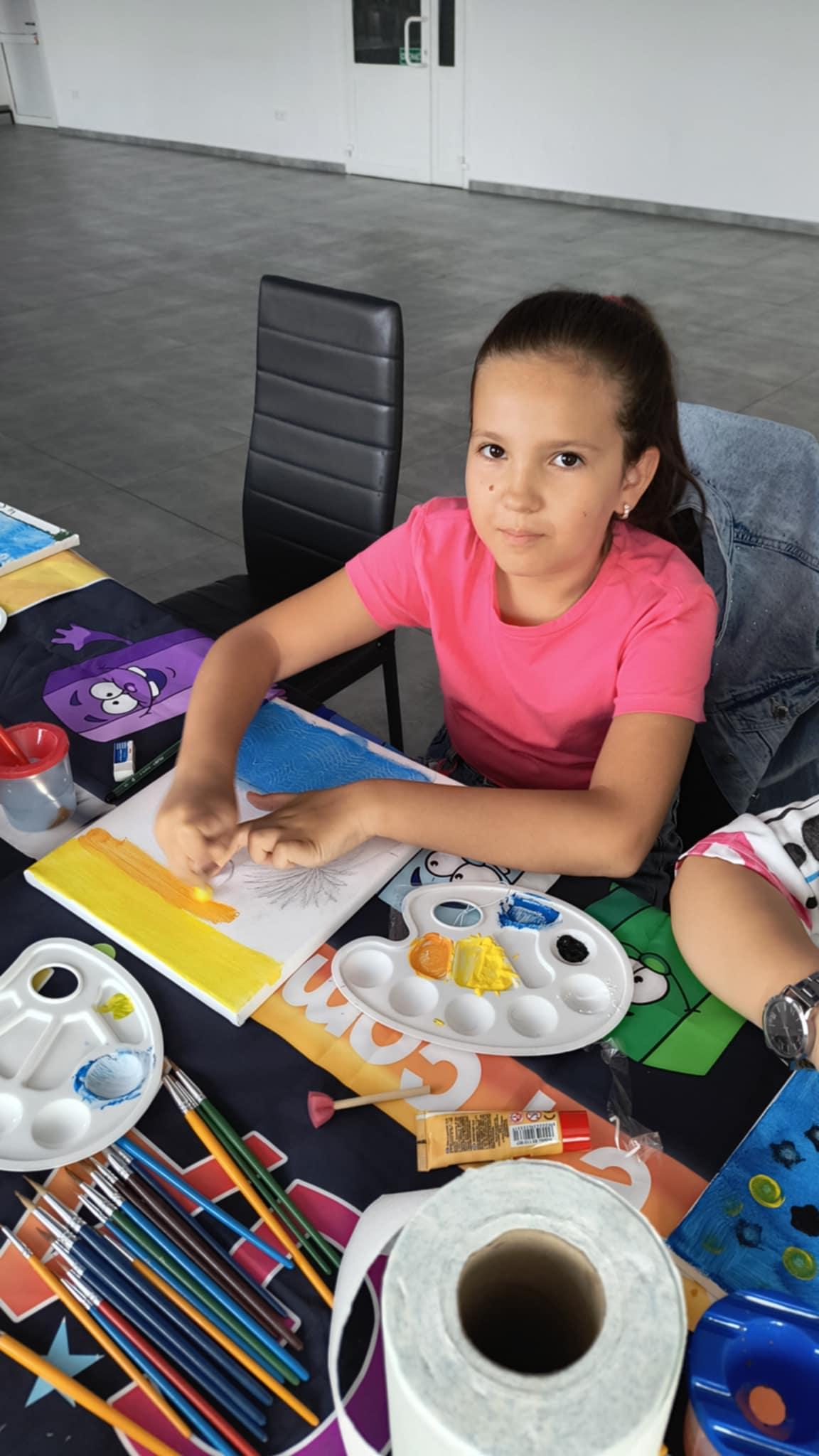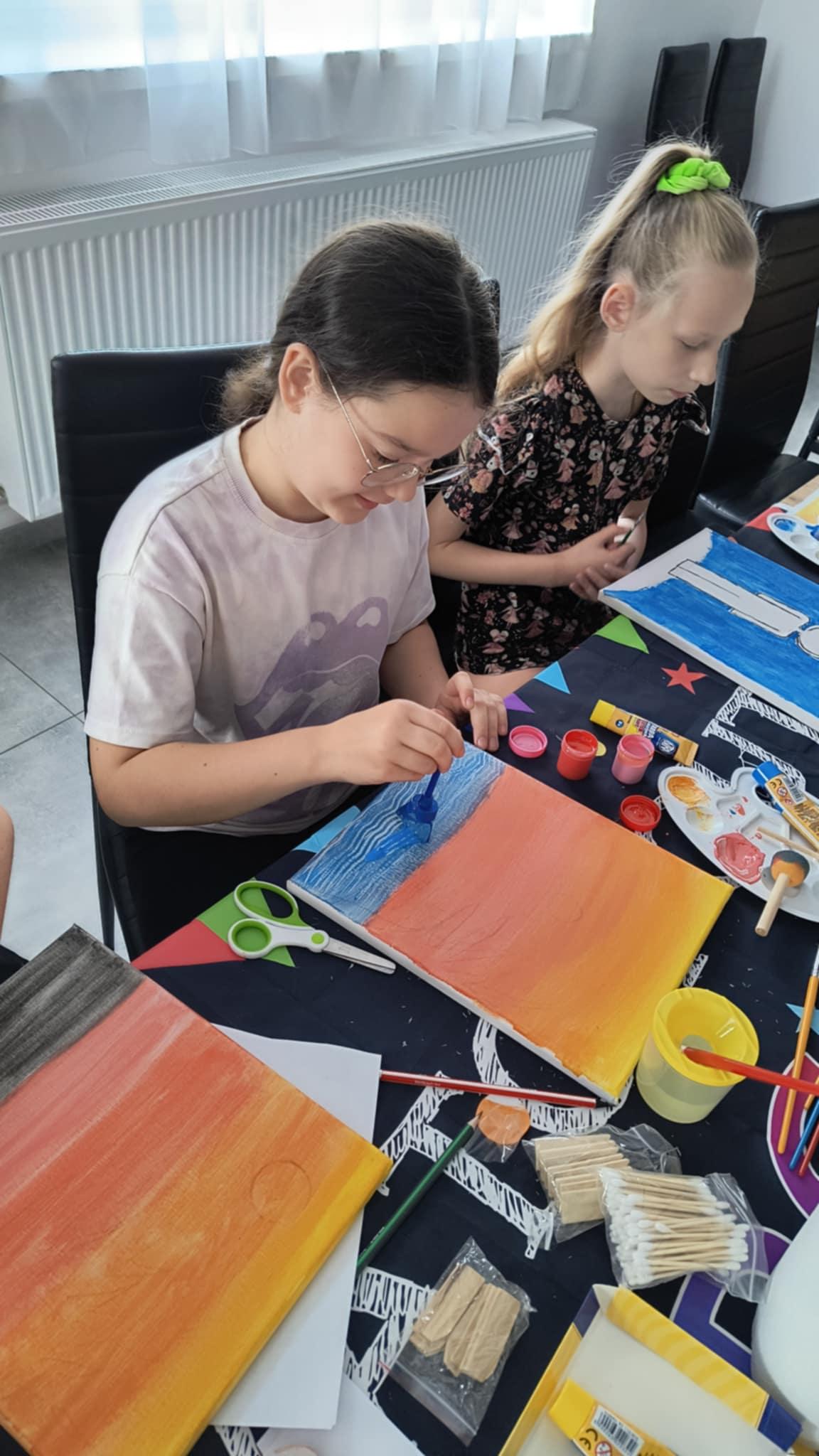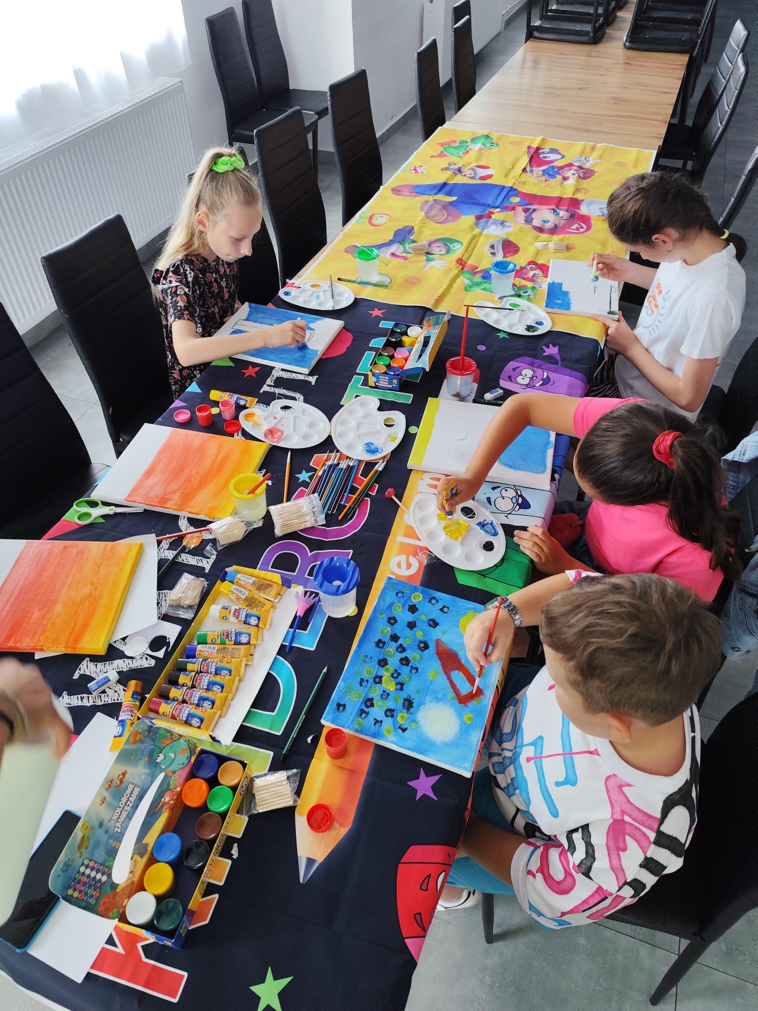 Spotkanie rozpoczęło się od wspólnego stworzenia regulaminu i zasad zachowania, które będą obowiązywać podczas całych wakacyjnych spotkań. Pierwsze warsztaty obfitowały w różnorodne aktywności. Dzieci mogły spróbować swoich sił w malowaniu na płótnie, wykorzystując różne techniki i metody artystyczne. Nie zabrakło również zajęć manualnych, uczestnicy wykonali breloczki ozdabiane cyrkoniami, które każdy mógł zabrać na pamiątkę. Z kolei wyjście na plac zabaw pozwoliło dzieciom rozruszać się i spędzić trochę czasu na świeżym powietrzu.