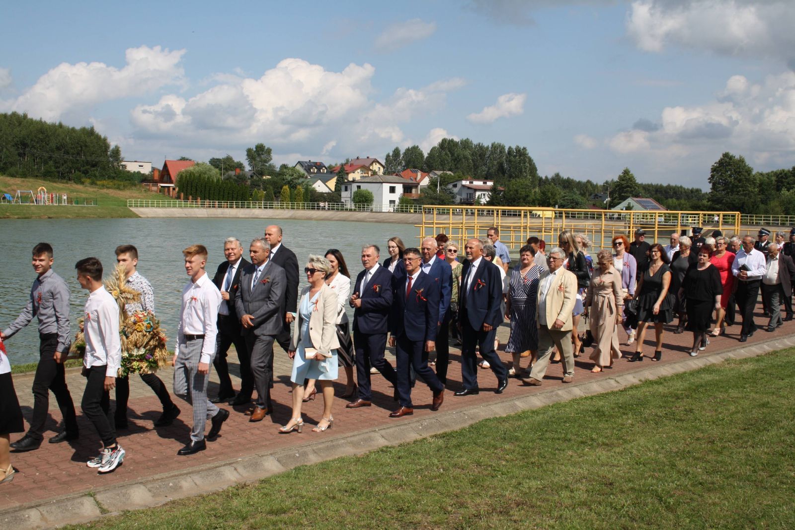 Dożynki rozpoczęły się mszą świętą dziękczynną za zebrane plony, którą odprawił zaproszony ksiądz Prałat Stanisław Szczerek oraz ks. Proboszcz Parafii Jastrząb Zbigniew Tuchowski. Następnie po ceremonii korowód dożynkowy z pięknymi wieńcami, przygotowanymi przez sołectwa Gminy Jastrząb oraz sołectwo Bieszków Górny, wraz z zaproszonymi gośćmi i mieszkańcami przemaszerował z kościoła nad zalew w Jastrzębiu, gdzie odbyła się dalsza część programu. Wójt Gminy Andrzej Bracha przywitał przybyłych gości oraz mieszkańców. Na uroczystości mogliśmy gościć Ministra Marka Suskego, Posłów na Sejm Annę Kwiecień, Agnieszkę Górską oraz Andrzeja Kosztowniaka, Mariusza Skopka przedstawiciela Posła Konrada Frysztaka, Anitę Gołosz Wicestarostę Powiatu Szydłowieckiego, Lucynę Wiśniewską – Dyrektora Powiatowej Stacji Sanitarno-Epidemiologicznej w Radomiu, Elżbietę Pawlak – Dyrektora Powiatowej Stacji Sanitarno-Epidemiologicznej w Szydłowcu, Monikę Pachniewską Kierownika Placówki Terenowej KRUS w Radomiu, Przewodniczącego Rady Gminy Sławomira Binkowskiego, Wiceprzewodniczącego Rady Gminy Wojciecha Warso, Jana Gulę Prezesa Stowarzyszenia LGD Razem na Piaskowcu, Radnych Powiatu Szydłowieckiego, Wójtów ościennych gmin, radnych i sołtysów gminy Jastrząb, dyrektorów szkół, przedszkola i żłobka, Komendanta i Prezesów OSP, Zespoły Ludowe, Koła Gospodyń Wiejskich, Stowarzyszenie Pogodnych Seniorów Gminy Jastrząb, mieszkańców gminy Jastrząb oraz ościennych gmin.
