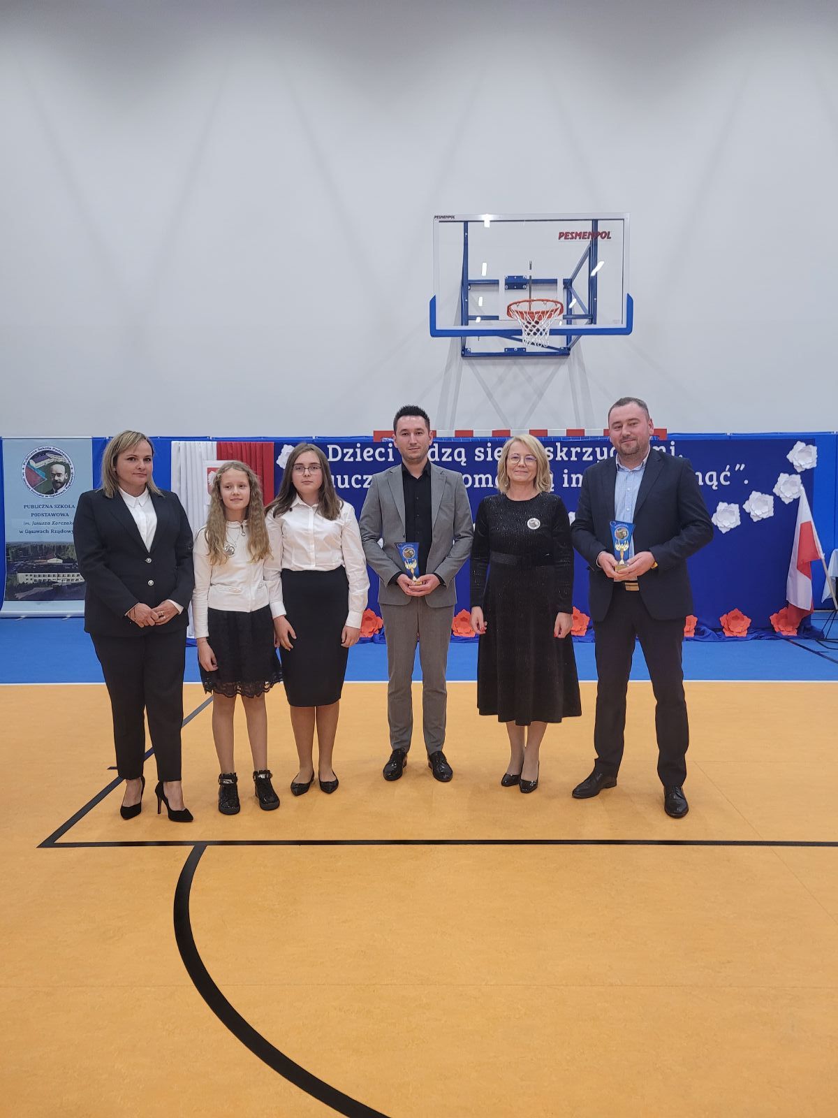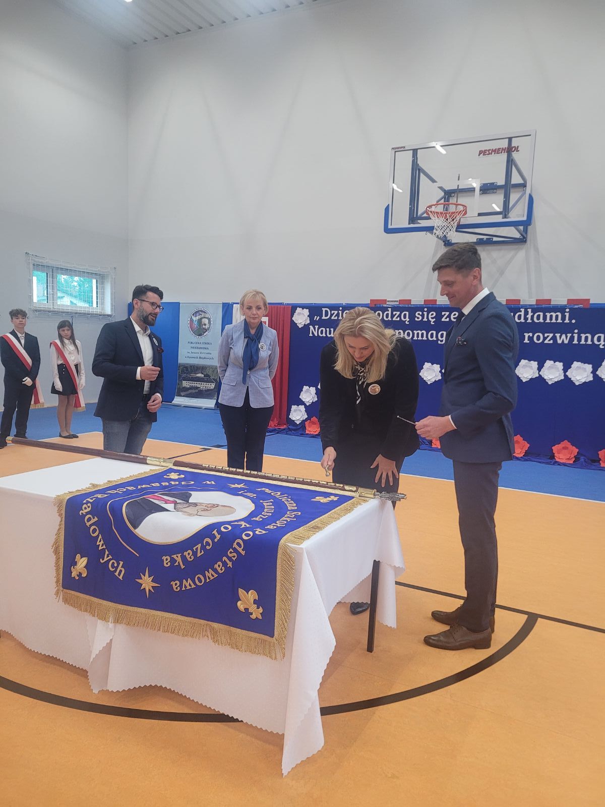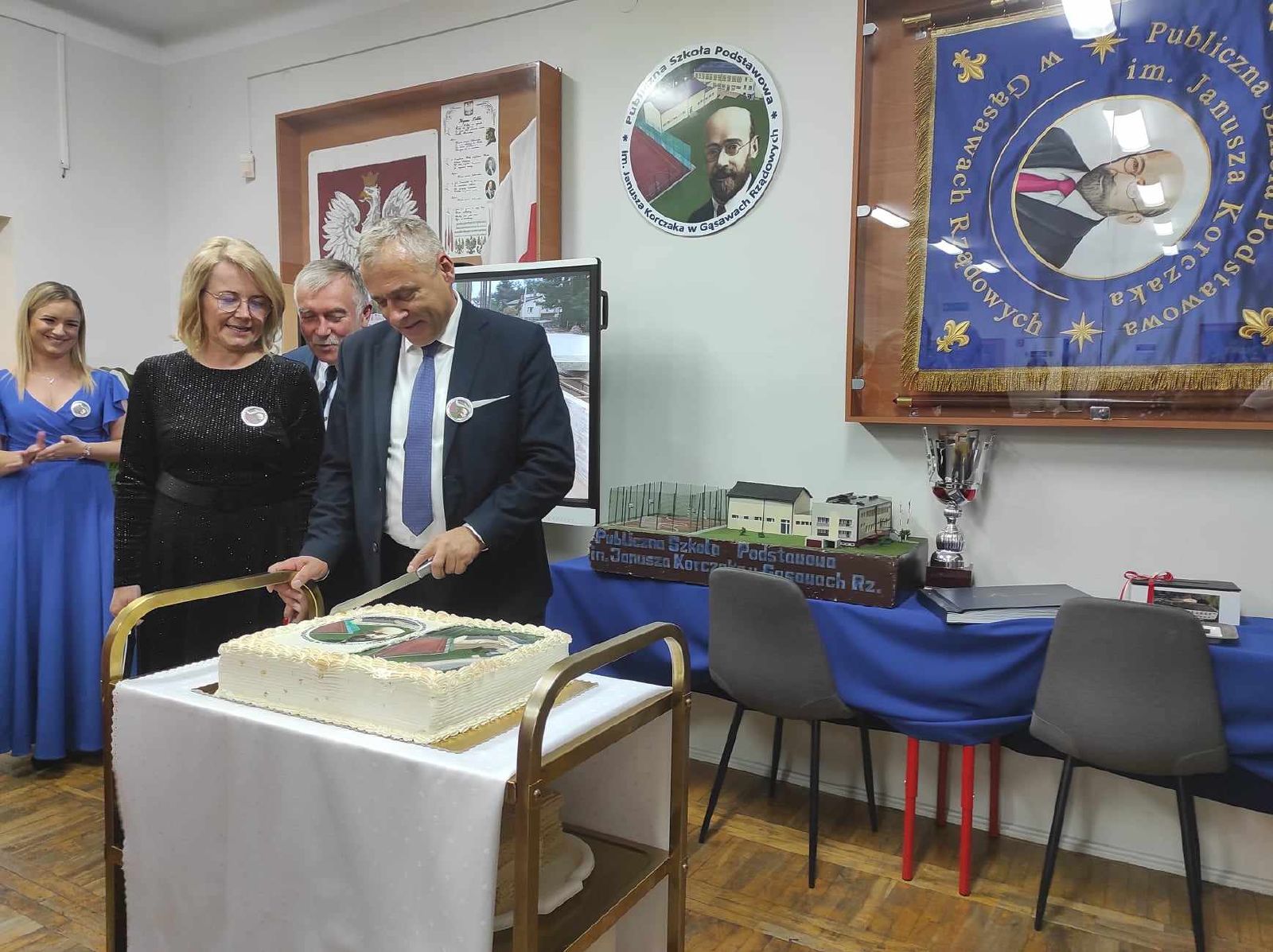 W dniu 7 października br. odbyło się oficjalne otwarcie sali gimnastycznej oraz nadanie imienia i sztandaru Publicznej Szkole Podstawowej im. Janusza Korczaka w Gąsawach Rządowych. Uroczystość rozpoczęła się mszą świętą w pobliskim kościele pod wezwaniem Świętego Edwarda. Ceremonię mszalną odprawił ksiądz proboszcz Krzysztof Świątek oraz gościnnie ksiądz proboszcz parafii Jastrząb Zbigniew Tuchowski. Podczas nabożeństwa poświęcono nowy sztandar szkoły. Po czym wszyscy zaproszeni goście wraz z mieszkańcami udali się w przemarszu do nowego wybudowanego obiektu, gdzie rozpoczęła się oficjalna ceremonia otwarcia sali. W wydarzeniu uczestniczyli posłowie RP: Agnieszka Górska, Anna Kwiecień, Radosław Fogiel jak również Aurelia Michałowska - Mazowiecki Kurator Oświaty, Adrian Barański - Dyrektor Kuratorium Oświaty w Warszawie, Delegatura w Radomiu, Edyta Wietrak - Kierownik Biura Powiatowego ARiMR w Szydłowcu, Katarzyna Dujka - Dyrektor Powiatowej Stacji Sanitarno-Epidemiologicznej w Szydłowcu, Andrzej Bracha - Burmistrz Jastrzębia wraz z małżonką Barbarą Brachą, Sławomir Bińkowski - Przewodniczący Rady Miejskiej wraz z Radnymi, Agnieszka Dąbrowska - Sekretarz Gminy, Mariusz Tomczyk - Kierownik Referatu, Justyna Grzmil - Kierownik Urzędu Stanu Cywilnego w Jastrzębiu, pracownicy Urzędu Miejskiego, Paweł i Przemysław Wiatrak - właściciele firmy Wiatrobud II (wykonawcy przedmiotowej sali gimnastycznej), Rafał Tomczyk - Projektant Inwestycji, Dyrektorzy pobliskich szkół, przedszkoli i żłobka, grono pedagogiczne wraz z emerytowanymi nauczycielami, przedstawiciele Kół Gospodyń Wiejskich, rodzice, uczniowie oraz mieszkańcy.