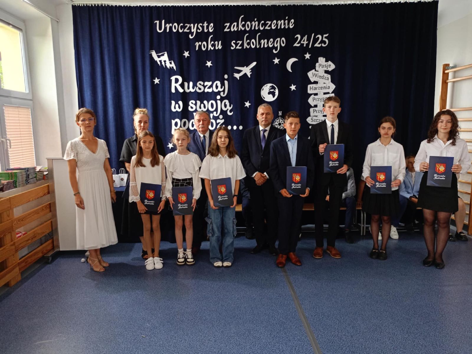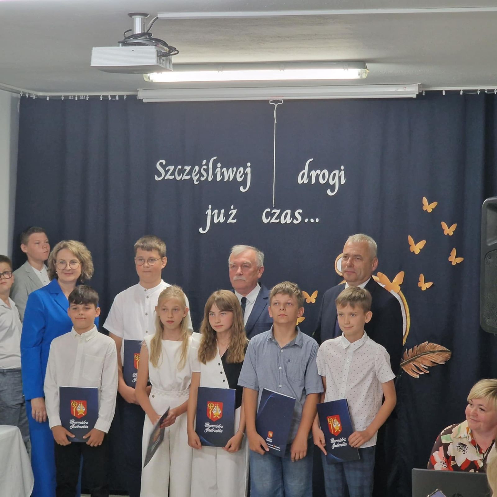 27 czerwca 2025r. w czasie uroczystości zakończenia roku szkolnego Burmistrz Jastrzębia Pan Andrzej Bracha oraz Przewodniczący Rady Miejskiej w Jastrzębiu Pan Sławomir Bińkowski w celu realizacji Lokalnego programu wspierania edukacji uzdolnionych uczniów uczęszczających do publicznych szkół podstawowych funkcjonujących na terenie Gminy Jastrząb wręczyli 61 uczniom stypendia Burmistrza Jastrzębia w wysokości 800 złotych dla każdego ucznia za wybitne wyniki w nauce osiągnięte w roku szkolnym 2024/2025. W uroczystościach wręczenia Stypendiów Burmistrza Jastrzębia uczniom towarzyszyli dyrektorzy szkół: Magdalena Bednarczyk, Beata Przytuła- Bińkowska, Marzena Sadza oraz Ewa Figarska.