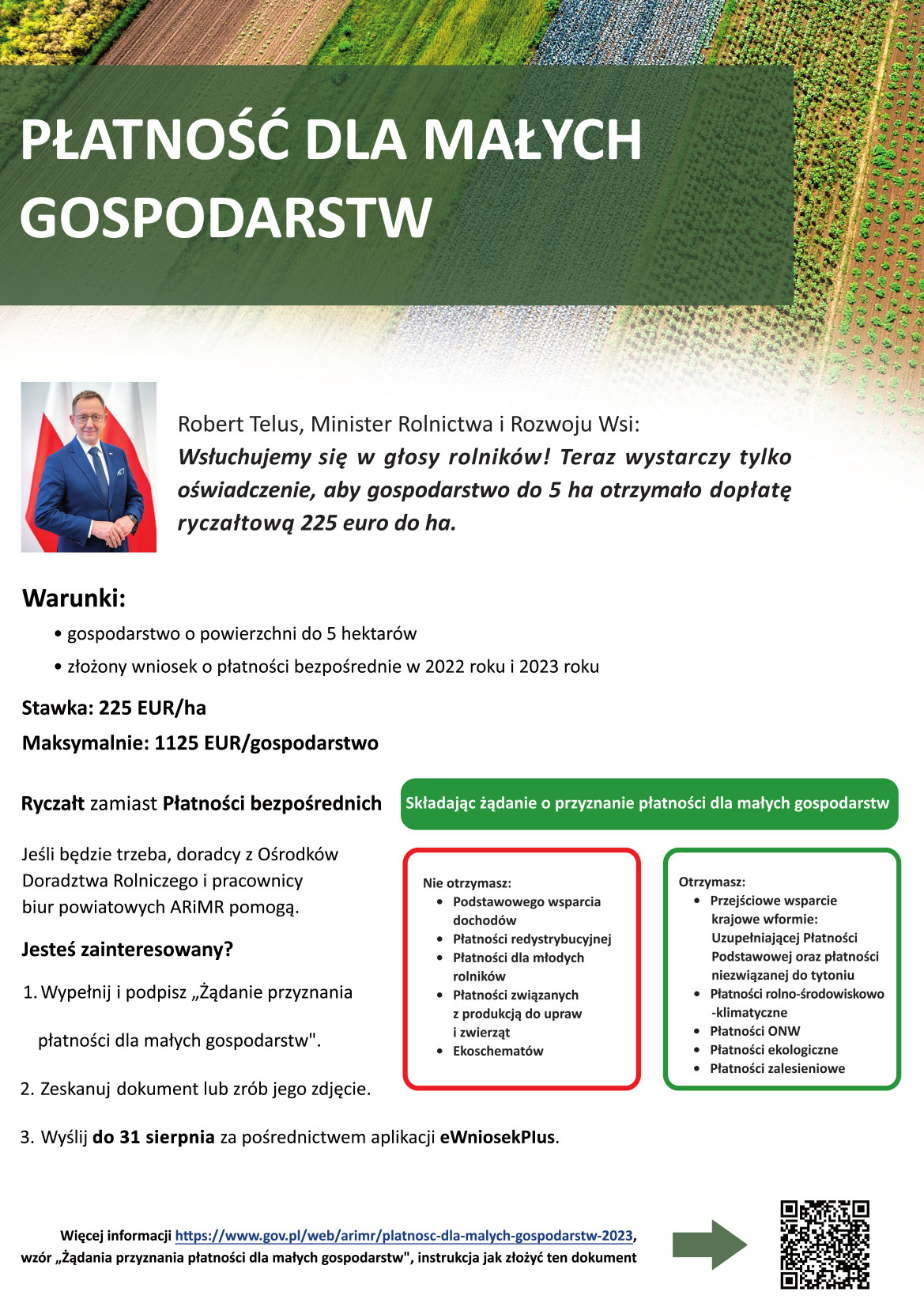 Więcej informacji https://www.gov.pl/web/arimr/platnosc-dla-malych-gospodarstw-2023, wzór „Żądania przyznania płatności dla małych gospodarstw", instrukcja jak złożyć ten dokument