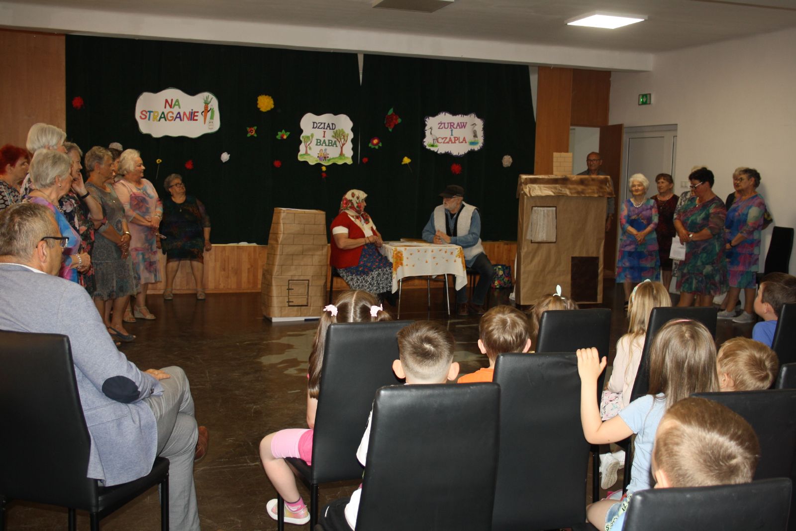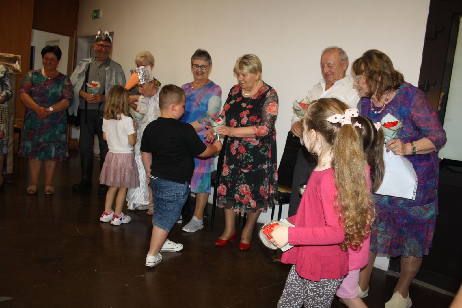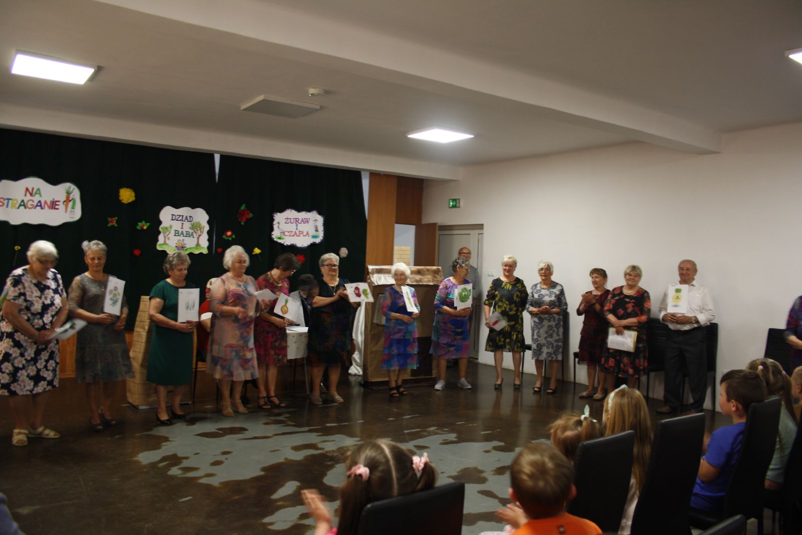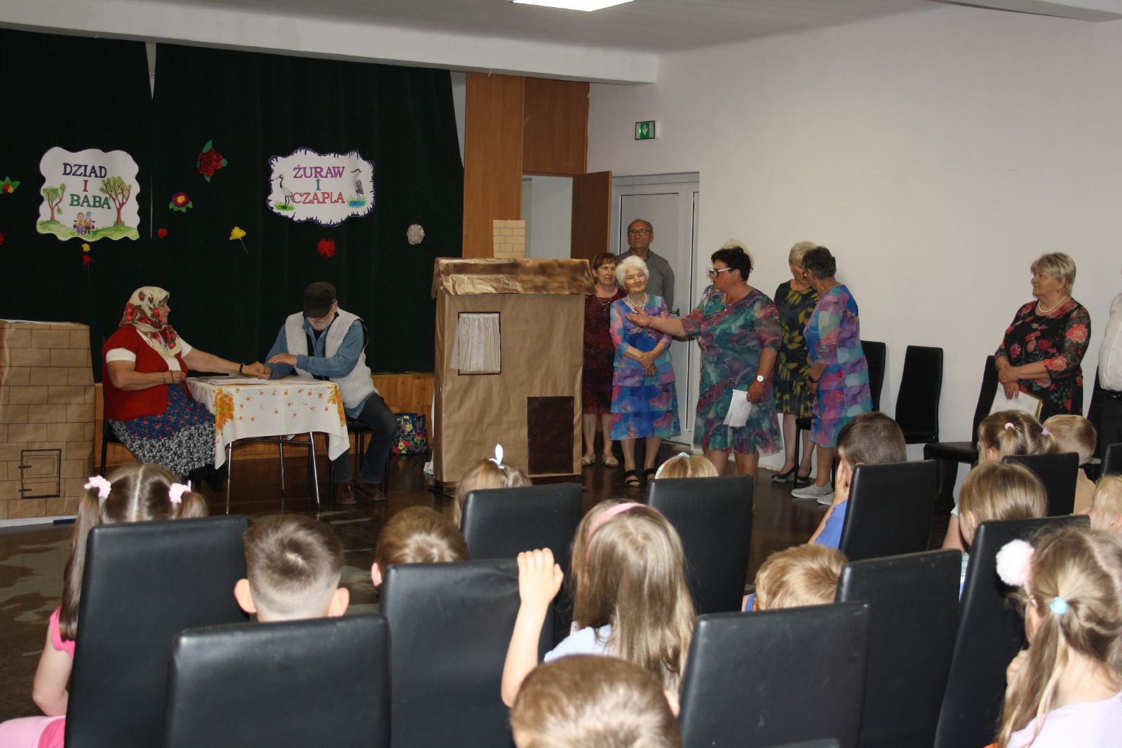Dnia 22 maja br. w Świetlicy Środowiskowej w Jastrzębiu odbyło się niezwykłe przedstawienie dla najmłodszych, które przygotowała grupa teatralna "Młodzi Duchem" ze Stowarzyszenia Pogodni Seniorzy z gminy Jastrząb. Podczas występu na widowni gościły maluchy z oddziału przedszkolnego z PSP w Jastrzębiu jak również Burmistrz Jastrzębia Andrzej Bracha. W związku z nadchodzącym dniem dziecka seniorzy zainscenizowali trzy bardzo znane wiersze tj. "Na straganie", "Żuraw i Czapla" autora Jana Brzechwy oraz "Dziad i Baba" Ignacego Kraszewskiego. Przedstawienie zakończyło się gromkimi brawami, a dzieci były zachwycone i rozbawione, uśmiech nie schodził im z twarzy. Dzieciaki za tak wspaniały występ przekazały każdemu z osobna urocze małe bukieciki oraz dyplom z podziękowaniem. Natomiast seniorzy obdarowali je słodkościami.