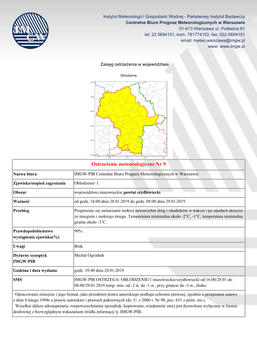 | Przebieg | Prognozuje się zamarzanie mokrej nawierzchni dróg i chodników w trakcie i po opadach deszczu ze śniegiem i mokrego śniegu. Temperatura minimalna około -2°C, -1°C, temperatura minimalna gruntu około -3°C. |