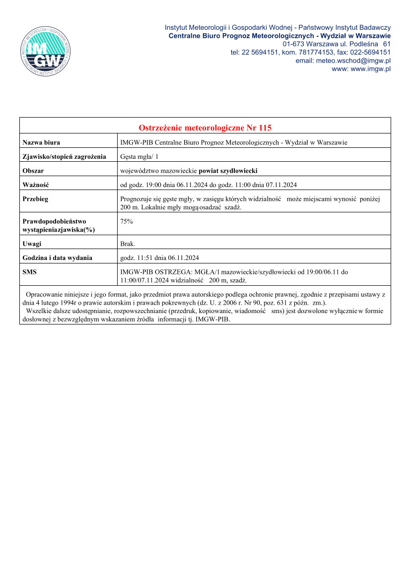 Ostrzeżenie meteorologiczne Nr 115