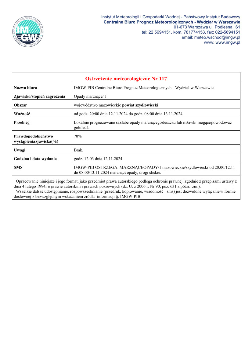 Ostrzeżenie meteorologiczne Nr 117