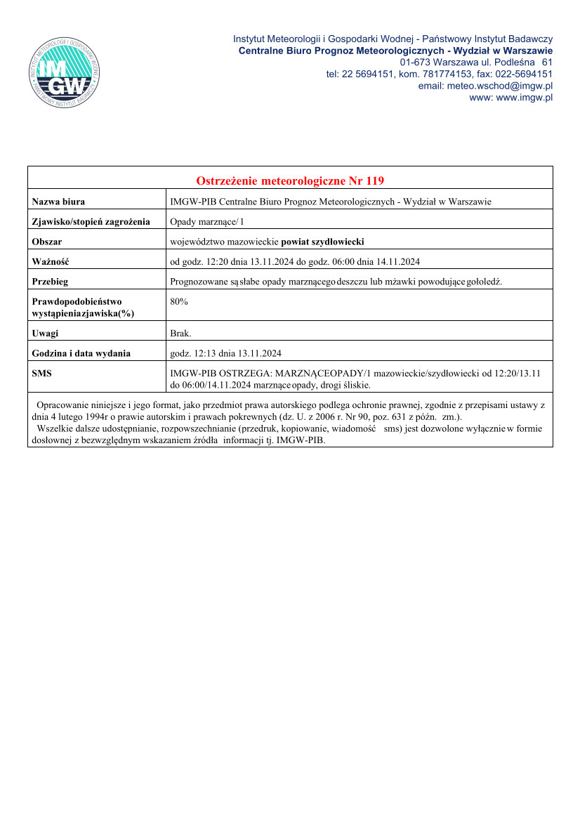 Ostrzeżenie meteorologiczne Nr 119