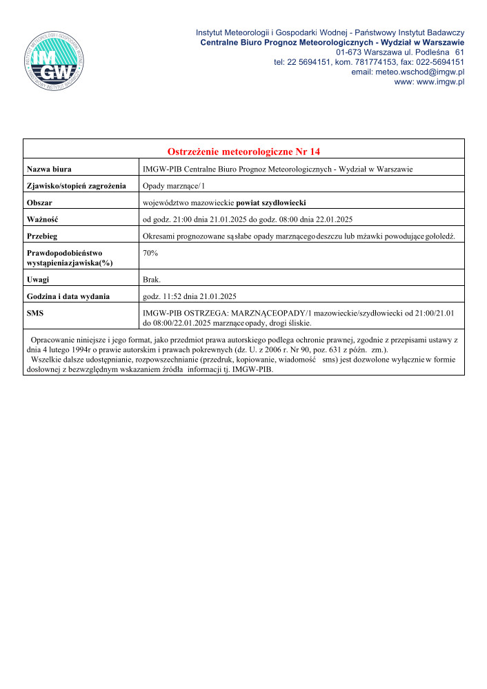 | Ważność | od godz. 21:00 dnia 21.01.2025 do godz. 08:00 dnia 22.01.2025 |