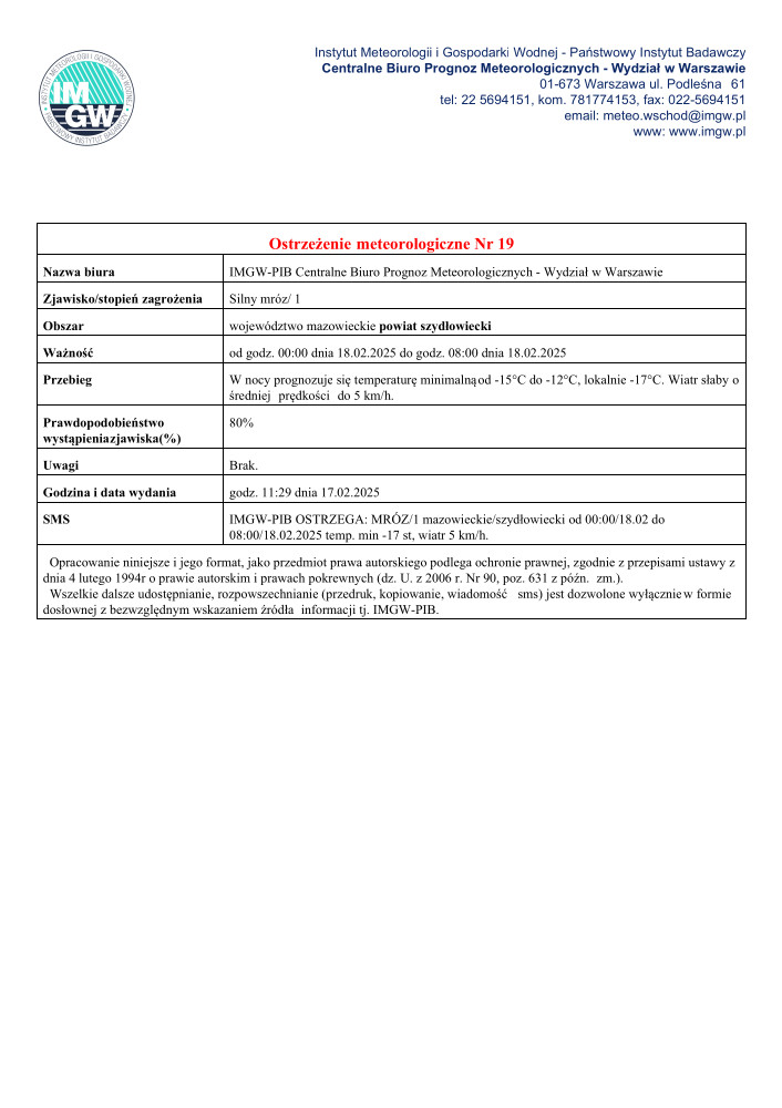 Ostrzeżenie meteorologiczne Nr 19